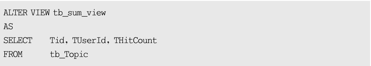 【例7-2】修改例7-1创建的视图stu_sc_view,其结构为:学号、姓名、课程编号和成绩。代码如下: