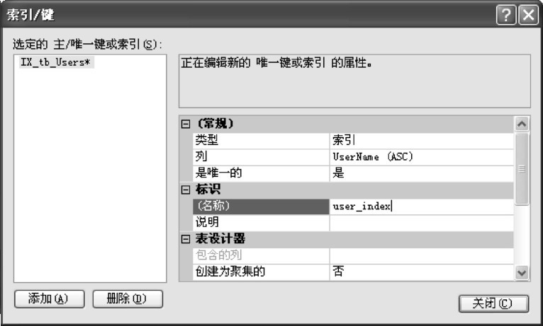 (3)打开“索引/键”对话框,单击“添加”按钮,按相关要求进行索引的设置。