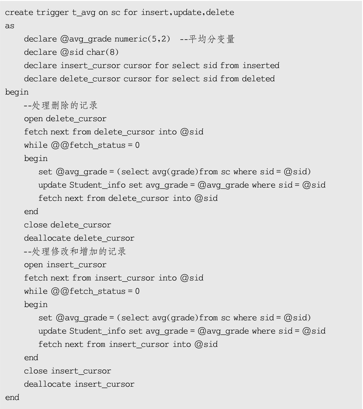 【例7-7】在SC表上建立触发器t_avg,实现根据成绩的变化自动修改学生的平均分字段的功能。代码如下: