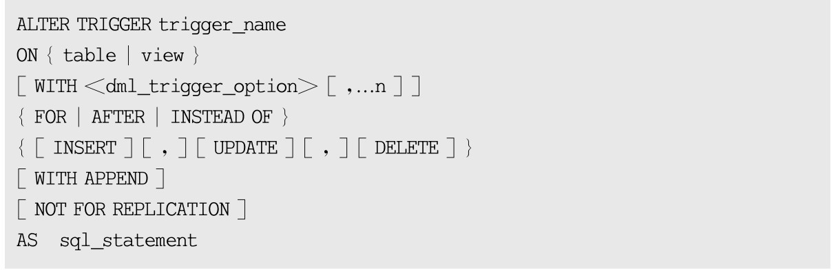 各参数含义与CREATETRIGGER相同。如果原来的触发器定义是用WITH ENCRYPTION或WITHRECOMPILE创建的,那么只有在ALTERTRIGGER中也包含这些选项时,这些选项才有效。