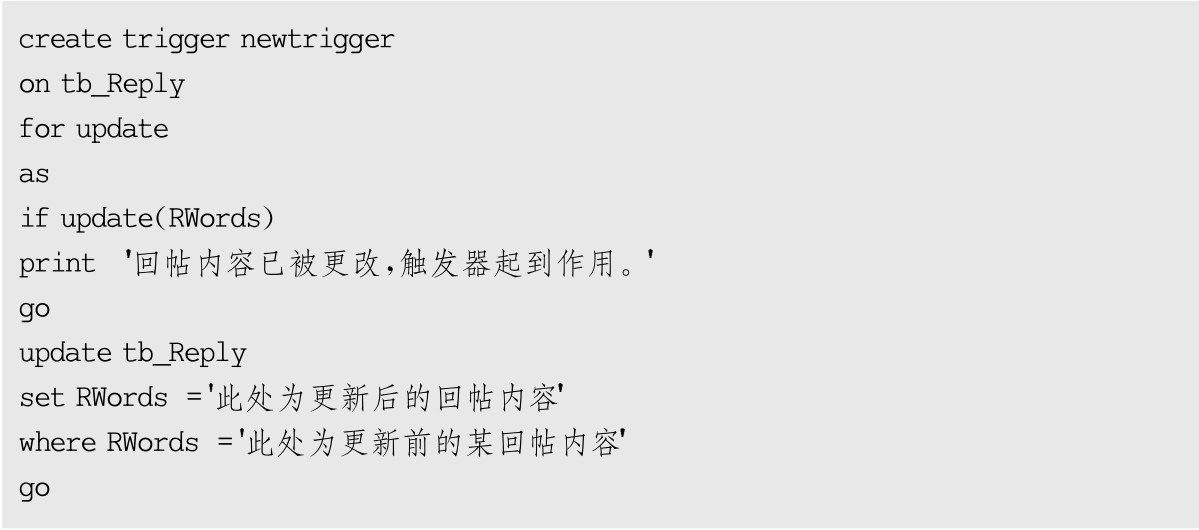 (2)新建SQL查询,输入TransacT-SQL语句,建立名为newtrigger的触发器,触发器规定当tb_Reply表格的回帖内容列的值发生变化的时候,显示出:“回帖内容已被更改,触发器起到作用”,再更改tb_Reply表格的RWords列的值以触发该触发器。操作成功后,保存该查询,把保存文件命名为newtrigger.sql。