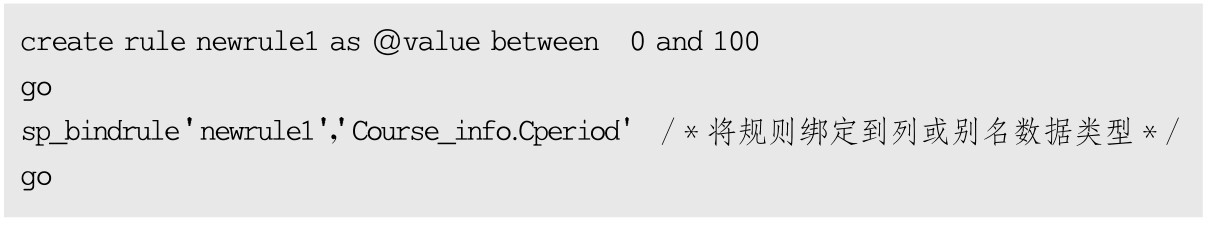 【例7-8】建立名为newrule1的规则,并把这个规则与Course_info表的Cperiod列结合。代码如下: