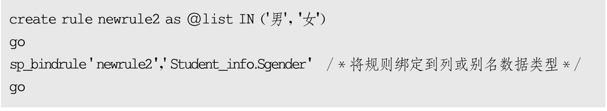 【例7-9】建立名为newrule2的规则,并把这个规则与Student_info表的Sgender列结合。代码如下: