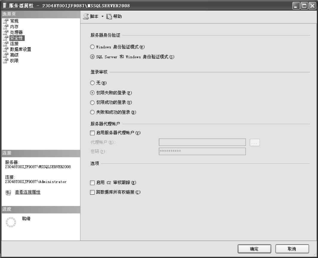 (3)打开“服务器属性”窗口,在左侧窗格中选择“安全性”选项,打开如图8-3所示的选项卡界面。根据实际需求,在“服务器身份验证”栏中选择需要的认证模式。