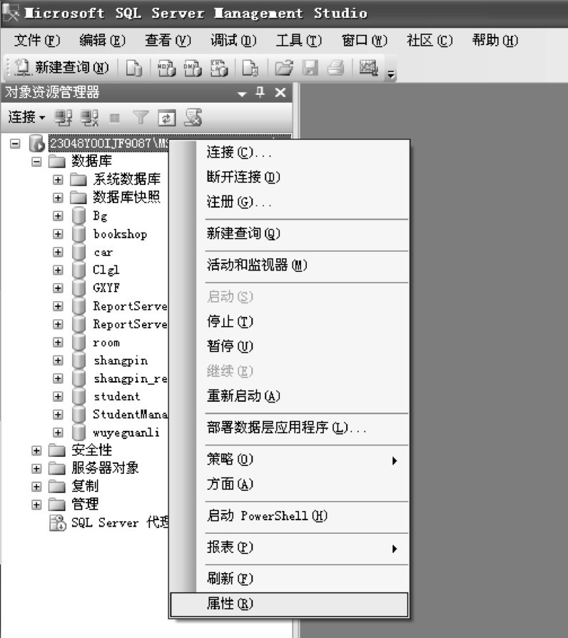 (2)右键单击服务器,在弹出的快捷菜单上执行服务器“属性”命令,如图8-2所示。