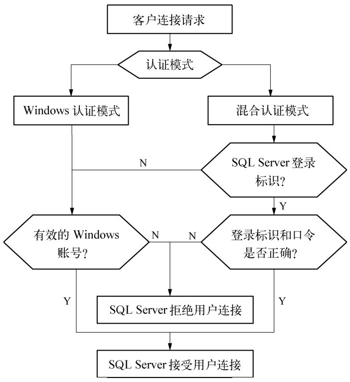 用户使用SQL Server数据库之前必须经过系统认证。认证是指当用户访问数据库系统的时候,系统对该用户账号和口令的确认过程,包括确认用户账号是否有效以及能否访问系统中的数据等。SQL Server服务器安全认证有两种模式:Windows身份认证模式与Windows和SQL Server混合身份认证模式。SQL Server的安全账户认证过程如图8-1所示。