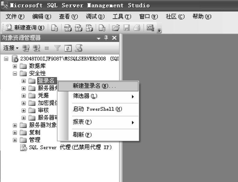 (2)右键单击“登录名”节点,在弹出的快捷菜单中执行“新建登录名”命令,如图8-4所示。