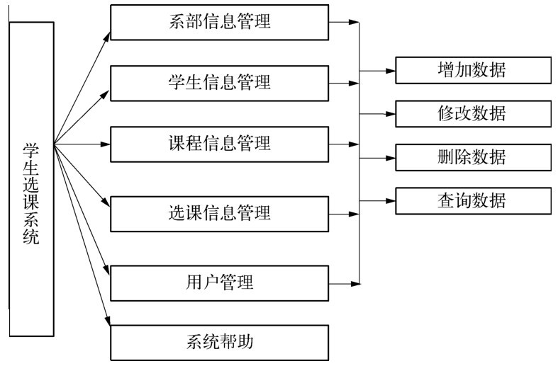 学生选课系统开发的主要目的是实现对学生基本信息的管理、系部管理、课程管理和选课管理基本功能以及用户管理的功能。具体包括学生基本信息的增加、修改、删除和查询;系部信息的增加、修改、删除和查询;课程信息的增加、修改、删除和查询;选课信息的增加、修改、删除和查询。系统的总体结构如图9-1所示。