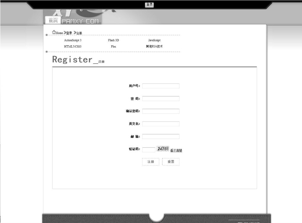 注册模块在管理信息系统开发中是一个必不可少的模块,注册模块让用户能够在管理信息系统中注册自己的信息,以便在以后的访问中可以直接登录,管理信息系统也可以通过注册模块保存已经注册成功的用户信息,让用户能够在管理信息系统对应的页面上随时查阅与修改自己的相关信息。用户注册页面如图9-21所示。