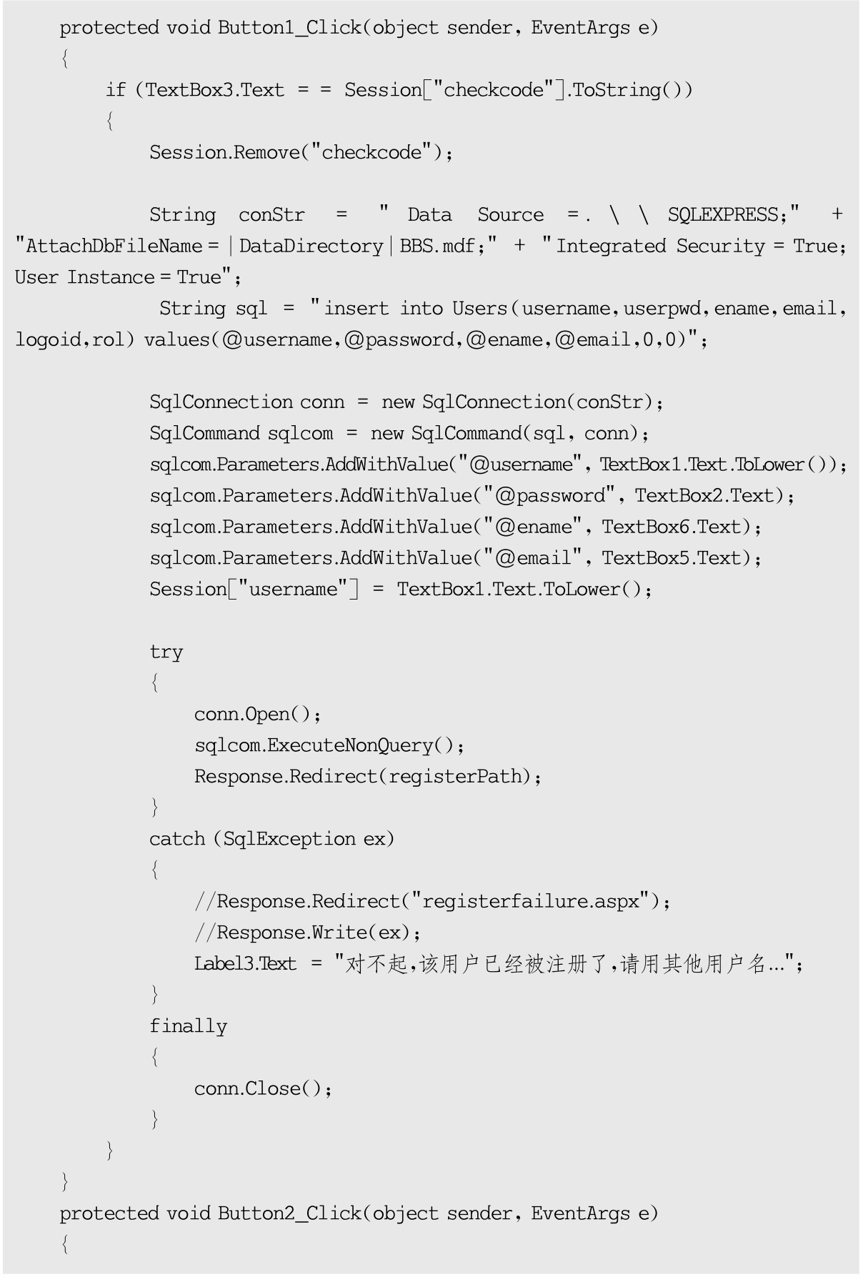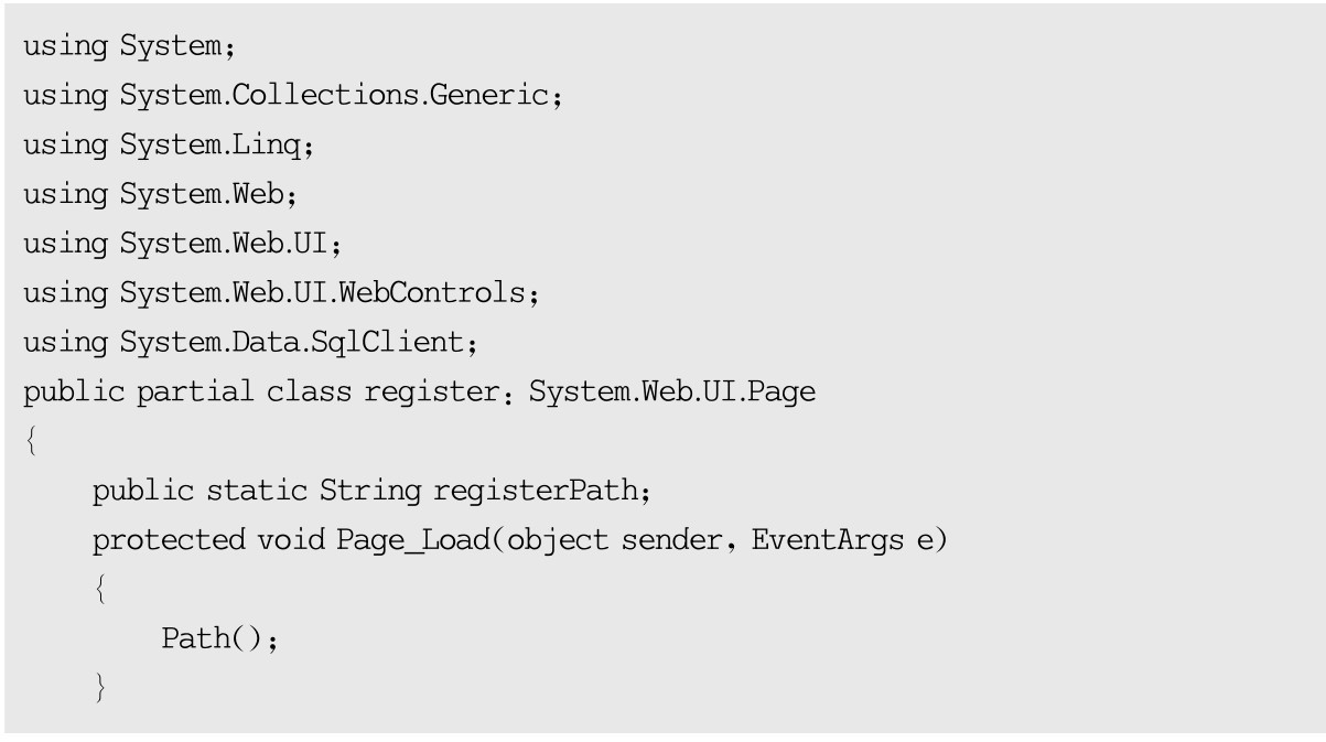 用户注册功能后台实现类文件register.aspx.cs的源代码如下: