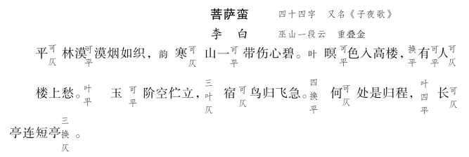 词谱是填词时的唯一依据。一般来说,词谱有两个含义:一是指词在平仄、用韵、字数、句数等方面的具体格律规定。如清人万树所著《词律》中《菩萨蛮》的词谱: