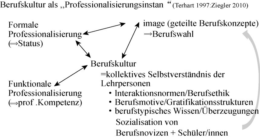 In einem Sammelband zur pädagogischen Professionalität verweist Ewald Terhart (1997) auf die vermittelnde Funktion der Berufskultur für das professionelle Handeln von Lehrkräften. Seine Überlegungen aufgreifend unterscheiden wir zwischen der „inneren“ und „äußeren“ Seite von Berufskultur und untersuchen das Zusammenwirken beider Seiten auch im Hinblick auf formale und funktionale Professionalisierung. Die äußere Sicht auf Berufskultur wäre gleichzusetzen mit dem öffentlichen Image eines Berufs bzw. mit dem öffentlich geteilten Verständnis bzw. Konzept des Berufs. Nach Gottfredson (1981) sind Berufskonzepte weitgehend universelle Vorstellungen über Berufe. Diese Vorstellungen beginnen sich bei Individuen über die reale oder medial vermittelte Wahrnehmung eines Berufs in sozialen Kontexten früh zu konstituieren. Maßgeblich dabei ist die Wahrnehmung der personalisierten Vertreter eines Berufes. Die innere Seite der Berufskultur ist dagegen das kollektive Selbstverständnis der Berufsangehörigen. Dies umfasst berufsethische Normen, das berufstypische Wissen, sowie deren Berufsmotive bzw. die von ihnen wahrgenommenen Gratifikationsstrukturen. Es wird unterstellt, dass sowohl die innere als auch die äußere Sicht auf die Berufskultur in einem Wirkungszusammenhang mit formalen und funktionalen Professionalisierungsprozessen steht. In der Berufskultur manifestiert sich sozusagen der jeweils erreichte Stand der Professionalisierung. Den unterstellten Zusammenhang veranschaulicht Abb.2.