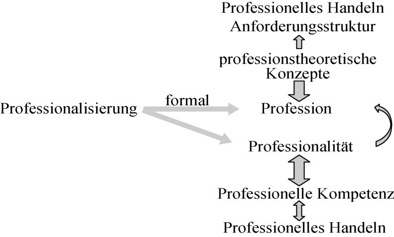 Auch Professionen haben in modernen Industriegesellschaften einen gehobenen Status innerhalb der Berufsformen erreicht. Sie gelten als kognitiv besonders anforderungsreich, genießen ein höheres gesellschaftliches Ansehen, u.a. weil sie in gesellschaftlich existentiellen Bereichen, wie z. B. in der Medizin oder Rechtsprechung tätig sind, die Ausbildung anspruchsvoll und nicht jedem zugänglich ist. Professionalisierung kann so gesehen zum einen als Prozess verstanden werden, der ganz allgemein den Anstieg des Status eines Berufs beschreibt, oder spezifischer die Entwicklung vom Beruf zur Profession. Zum anderen kann Professionalisierung auch einen individuellen Entwicklungsprozess vom Novizen zum Professionellen meinen. Der „Aufstieg“ eines Berufs zum Status einer Profession soll im Folgenden als „formale Professionalisierung“, die Entwicklung vom Novizen zum Professionellen als „funktionale Professionalisierung“ bezeichnet werden (Ziegler, 2004; Grollmann, 2005; Lempert, 2010). Ergebnis formaler Professionalisierung ist die gesellschaftliche Anerkennung als Profession, Ergebnis funktionaler Professionalisierung wäre die Zuschreibung von Professionalität, die auf professioneller Kompetenz basiert und sich im professionellen Handeln manifestieren muss. Mit der Modellierung und dem Erwerb professioneller Kompetenz befasst sich vor allem die pädagogisch-psychologische Forschung, während sich professionstheoretische Konzepte aus einer gesellschaftstheoretischen Perspektive formalen Professionalisierungsprozesse und Besonderheiten von Professionen widmen. Letztere liefern aufschlussreiche Analysen zur Anforderungsstruktur des professionellen Handlungsfeldes. Abb.1 visualisiert diesen begrifflich-konzeptuellen Rahmen.