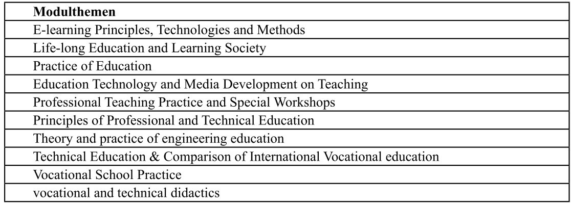 Um an dieser Stelle exemplarisch Vergleichswerte zu derartigen Inhalten in Deutschland zu liefern, ist in Bezug auf den Studiengang „Berufliche betriebliche Bildung“ an der Justus-Liebig-Universität Gießen beispielsweise anzuführen, dass den berufspädagogischen Inhalten entsprechend der prozentuale Anteil der angebotenen Inhalte im Bachelorstudiengang 23,4% entspricht, im Master sind es 12,2%. Im prozentualen Vergleich scheinen diesbezügliche Inhalte an der JLU Gießen höher.