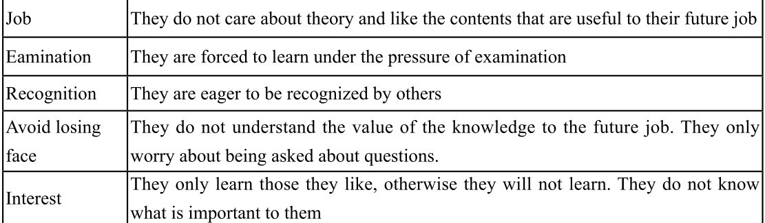 The teachers also think that the students have low learning abilities for self-directed learning, but their self-directed learning will be improved dramatically after the students go to practical environment. Some teachers also mentioned that the students have low basic skills in reading, writing and calculating.