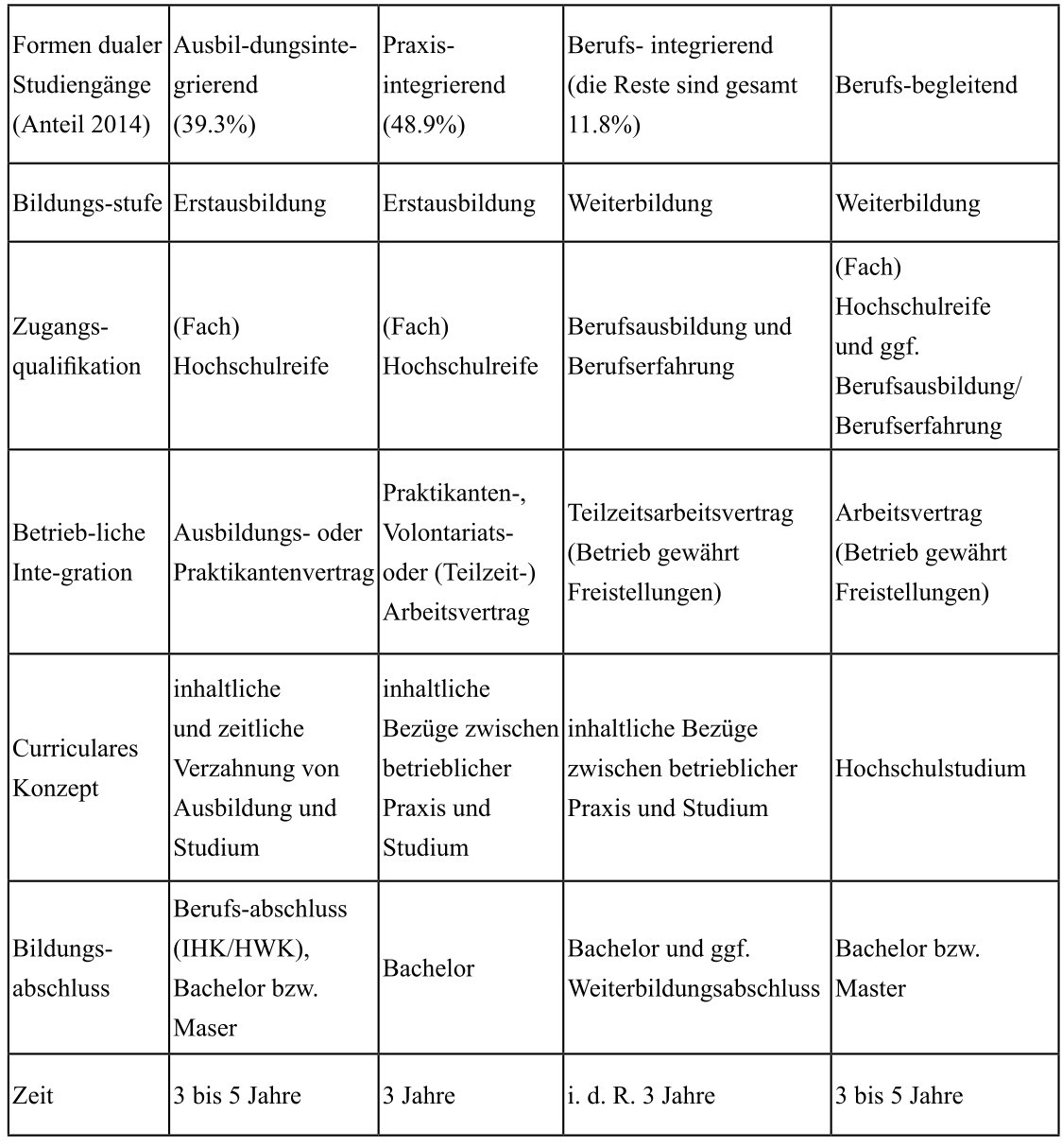 Nach dem Grad der Intensität und der Art der Integration des theoretischen und des praktischen Teils des dualen Studiums lassen sich vier Formen unterscheiden (Holtkamp, 1996; BIBB, 2014):