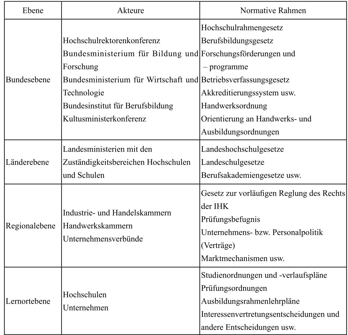 Tab.2 Zuständigkeitsstruktur des dualen Studiums auf verschiedenen Ebenen Quelle: Eigene Darstellung in Ahnllehnung an Krone, 2015; BMBF, 2003