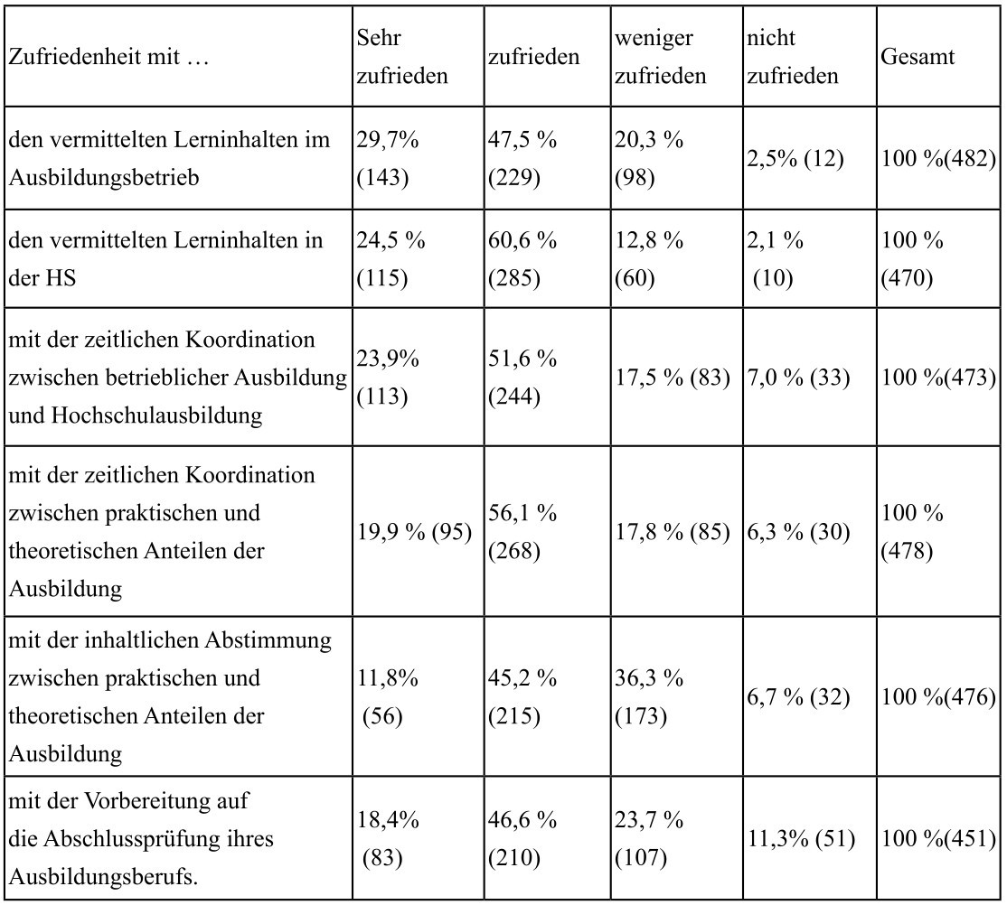 In diesem Teil soll die Zufriedenheit, der im Projekt „Duale Studiengänge“ befragten Studierenden, mit Hinblick auf die Verzahnung von Hochschul- und Berufsbildung im dualen Studium näher beleuchtet werden (Tab.4). Insgesamt sind die Befragten hoch zufrieden bis zufrieden mit der Verbindung von Theorie und Praxis im dualen Studium.