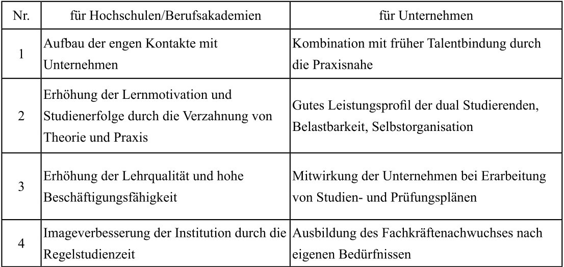 Wegen der langen Tradition und dem guten Ruf in der Industrie ist das Interesse chinesischer Wissenschaftler am deutschen Modell des praxisorientierten Studiums an Fachhochschulen als auch an den dualen Berufsakademien groß ( http://www.daad.org.cn/aktuelles-china/duales-studium-made-in-baden-wuerttemberg-in-china-vorgestellt). Der chinesische Wissenschaftler Gao Song (Gao Song, 2012) meint, dass die Absolventen durch das duale Studium die Ansprüche der modernen industriegesellschaftlichen Entwicklung erfüllen können. Ein anderer chinesischer Wissenschaftler Xiong Huojin glaubt, dass das duale Studium auch zu dem neuen „Konzept der Humanressourcen“ passt, weil sich die Fähigkeit der Selbstentwicklung in der Praxis nach verschiedenen beruflichen Anforderungen steigern kann. Nach der Entwicklungserfahrung kann das duale Studium die Bedürfnisse dieser Anforderung befriedigen (Xiong Huojin, 2009).