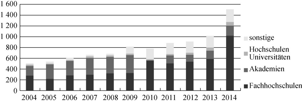 Seit den ersten Modellversuchen bis in die Gegenwart sind die „Studienformen dualer Prägung als sinnvolle Ergänzung des Studienangebots“ empfohlen (WR, 2002). Duale Studiengänge sind in den 1980er Jahren erstmals als innovativer Bildungsweg an Fachhochschulen eingeführt worden (Purz, 2011) und haben sich seit Mitte der 1990er Jahre in größerem Maße im Hochschulbereich bis an Universitäten ausgeweitet (Becker, 2006; BMBF, 2000). Ihre Zahl hat sich in den letzten 10 Jahren, von 2004 bis 2014, mehr als verdreifacht (Abb.1).