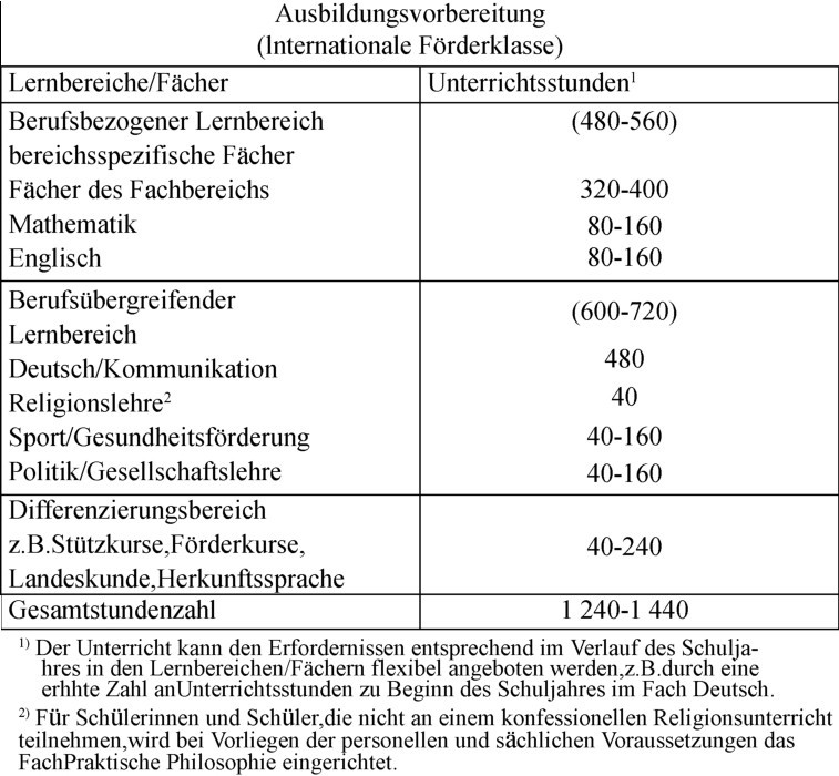 Internationale Förderklassen werden bei Bedarf mit Zustimmung der oberen Schulaufsichtsbehörde eingerichtet. Aufgenommen werden berufsschulpflichtige Jugendliche mit Zuwanderungsgeschichte, die zum ersten Mal eine deutschsprachige Schule besuchen und deren Sprachkenntnisse eine Teilnahme am Regelschulunterricht noch nicht zulassen.[3]In Ausnahmefällen kann es auch dazu kommen, dass Lernende der Regelklasse aufgrund mangelnder deutscher Sprachkenntnisse den IFK zugeordnet werden. Abweichend von den Bestimmungen für die Regelklassen der AV, kann die IFK einmalig wiederholt werden – dies kann dazu führen, dass die Lernenden zwei Jahre in der Ausbildungsvorbereitung verbringen. Für die IFK wurde des Weiteren eine spezifische Stundentafel eingerichtet. Diese unterscheidet sich nur unwesentlich von der Stundentafel der Regelklassen, allerdings wird hier mit einem Stundenumfang von 480 ein deutlicher Schwerpunkt auf den Lernbereich Deutsch / Kommunikation gelegt(Abb.3).
