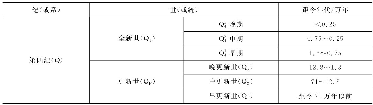 在地球形成至今的大约60亿年历史中,地壳经历了一系列的演变,形成了各种类型的地质构造、地貌以及复杂多样的岩石和土。地质年代是指地壳的发展历史、地壳运动、沉积环境及生物演变相应的时间段落。对建筑物场地进行工程评价时,离不开地质年代。在地质学中,把地质年代划分为太古代、元古代、古生代、中生代和新生代五大代,每个代又分为若干纪,每纪又分若干世及期。最近的地质年代是新生代第四纪,距今约100万年的历史。第四纪地质年代又可划分为更新世和全新世两类,如表1-1所示。工程上遇到的土都是在第四纪地质历史时期内形成的。