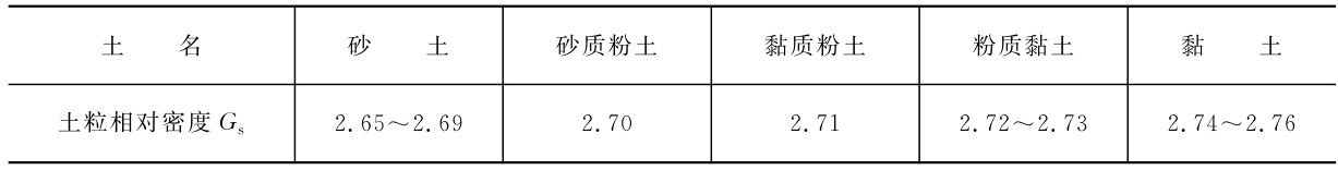 土粒相对密度在实验室内用比重瓶法测定。土粒相对密度主要取决于土矿物成分,不同土类的土粒相对密度变化幅度不大,在有经验的地区可按经验值选用。一般土粒的相对密度值见表1-6。