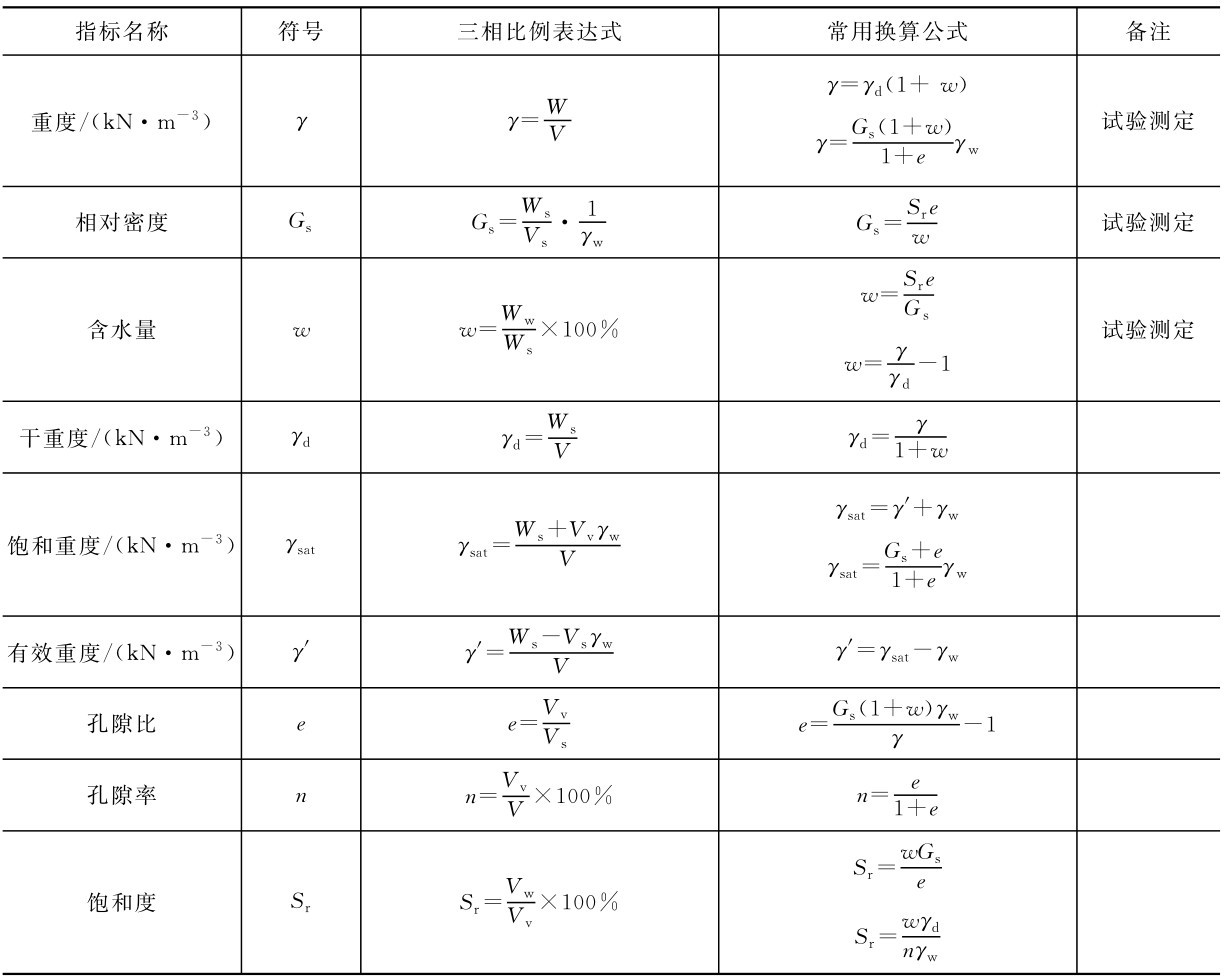 除了上述三个试验指标之外,还有六个可以通过换算求得的指标,称为换算指标,包括土的干重度、饱和重度、有效重度、孔隙比、孔隙率和饱和度。