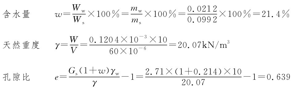 [例1-2] 某地基土样数据如下:环刀体积60cm3,湿土质量0.1204kg,干土质量0.0992kg,土粒相对密度为2.71。试计算:天然含水量w;天然重度γ;干重度γd。