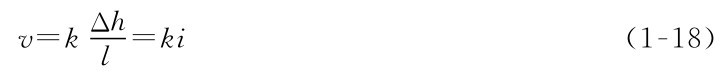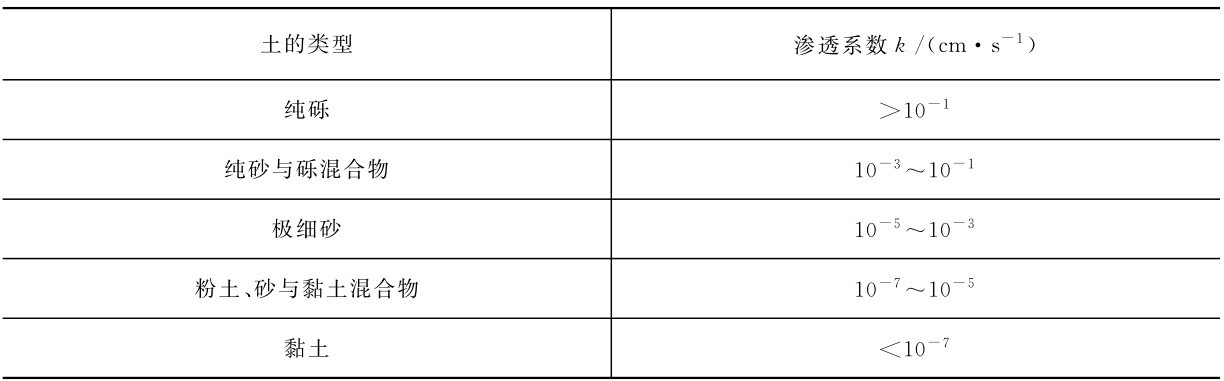 k——反映土的透水性能的比例系数,称为土的渗透系数(cm/s或m/昼夜),它相当于水头梯度i=1时的渗流速度,故其量纲与流速相同。渗透系数与土的性质有关,可以在试验室内或在野外测定,参考数值可见表1-16。