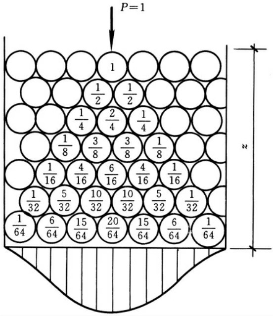 为了说明地基中附加应力扩散问题,假设地基土Η 为无数直径相同的小圆柱,则可按平面问题考虑。当地表受一个竖向集中力P=1作用时,如图2-12所示。图中第一层由一个小圆柱受力;第二层由两个小圆柱各受P/2的力;第三层三个小圆柱受力,两侧两个小圆柱各受力P/4,中间小圆柱受2P/4,……依次类推。由图可见,地表的竖向集中力传布越深,受力的小圆柱就越多,每个小圆柱所受的力也就越小。
