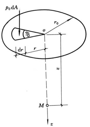 如图2-21所示,半径为r0的圆形面积上作用有竖向均布荷载p0,荷载中心点下任意深度z处M点的附加应力σz为