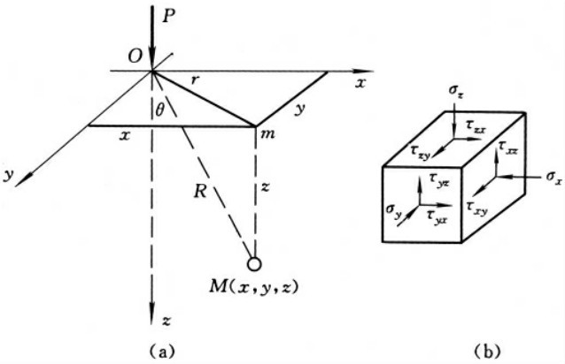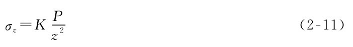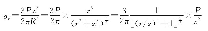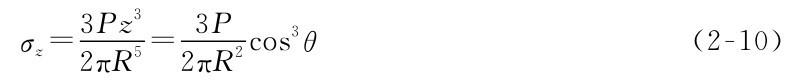 竖向集中力作用于半空间表面,如图2-13所示,在半空间任一点M(x,y,z)引起的全部应力(σx,σy,σz,τxy,τyz,τzx)和全部位移(ux,uy,uz)解,由法国的布辛奈斯克根据弹性理论求得。在6个应力分量中,与建筑工程地基沉降计算直接有关的为竖向正应力σz。地基中任意点M的竖向正应力的σz的表达式为: