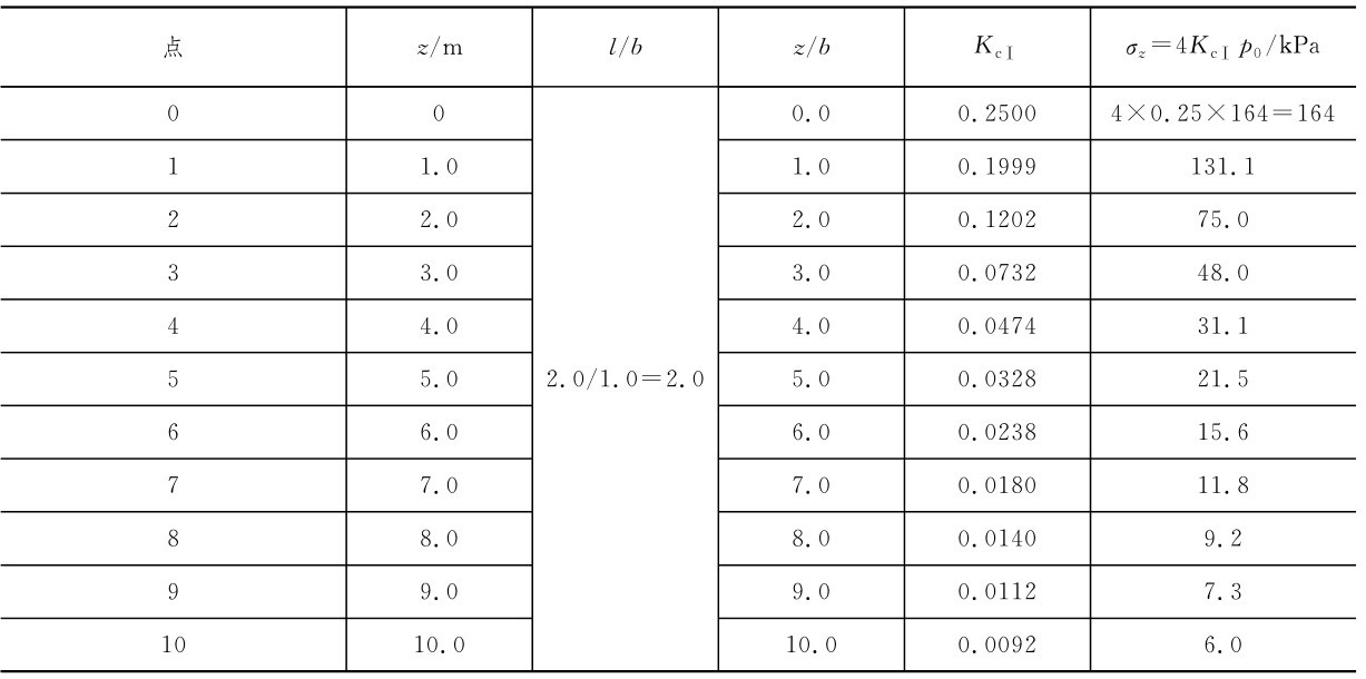 计算中心点下的附加应力时,通过基底中心点O将矩形基底分成四个相等的小矩形荷载面积,O点即为四个小矩形的公共角点。每个小矩形长l=2.0m,宽b=1.0m,长宽比l/b=2.0,用式(2-12a)列表计算地下10个点处的附加应力系数Kc(或由m,n查表2-3得),然后乘以4,即得相应点的附加应力系数,再乘p0,即得相应的附加应力σz。具体计算过程详见表2-4,中心点下各点的附加应力分布见图2-19。