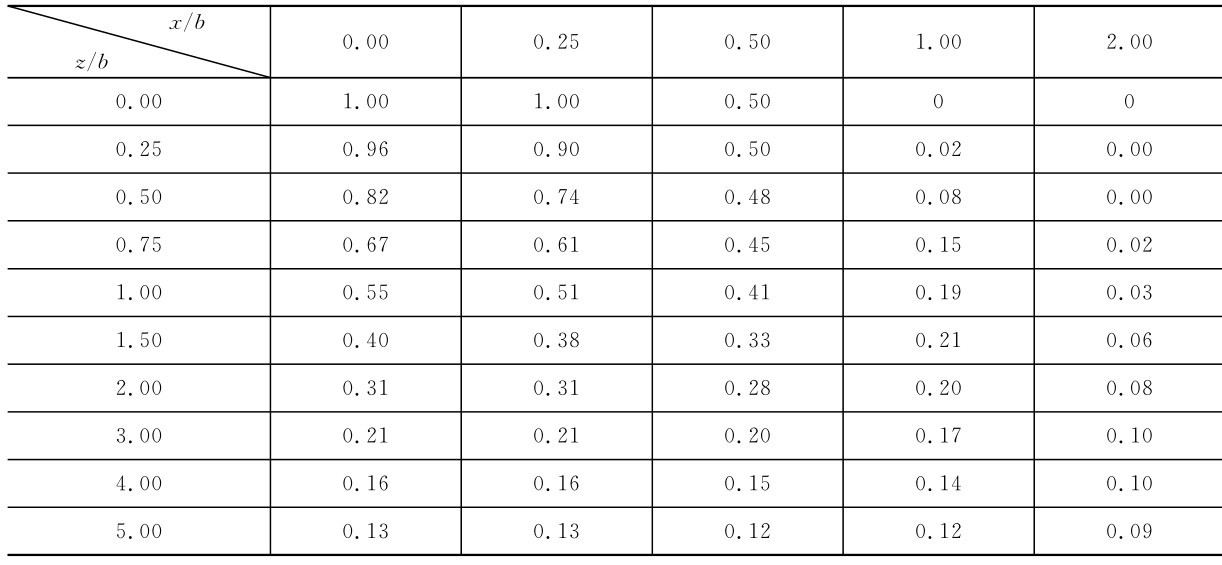 表2-3 矩形面积竖向均布荷载角点下的竖向附加应力系数Kc
