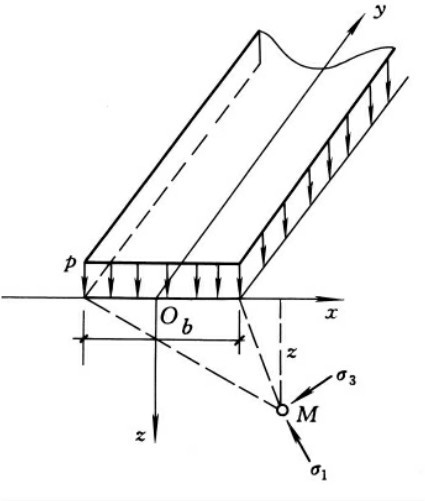 一般平面问题计算要比空间问题计算简单一些。理论上,当条形基础的长度l与宽度b之比,即l/b→∞时,且荷载在各个截面上的分布都相同时,土中的应力状态即为平面应变状态,这时垂直于长度方向的任一截面内附加应力的大小及分布规律都是相同的,而与所取截面的位置无关。实际工程中不存在l/b→∞的条形基础。但研究表明,当l/b≥10时,将其视为平面问题的计算结果所导致的误差很小。有时当l/b≥5时,按平面问题计算,也能保证足够的精度。因此,像墙基、路基、挡土墙及堤坝等条形基础,均可按平面问题计算地基中的附加应力。