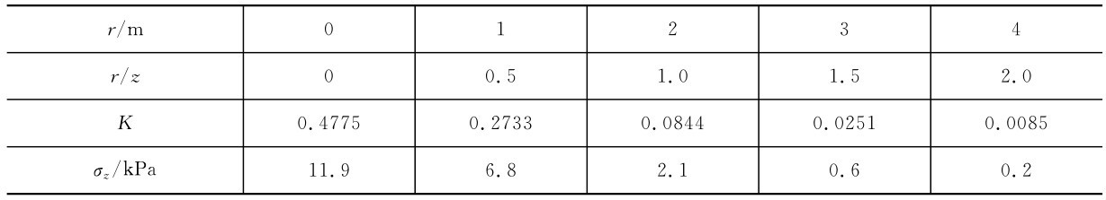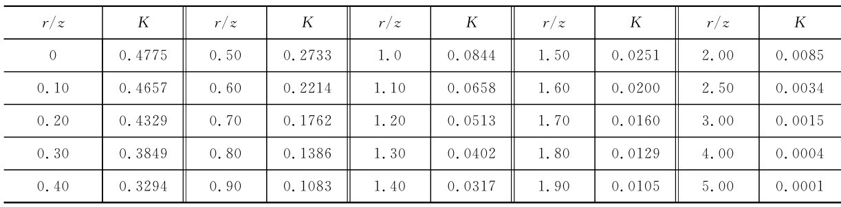 式中,K为集中荷载下地基竖向附加应力系数,按r/z由表2-1查得。