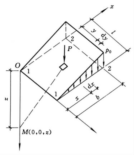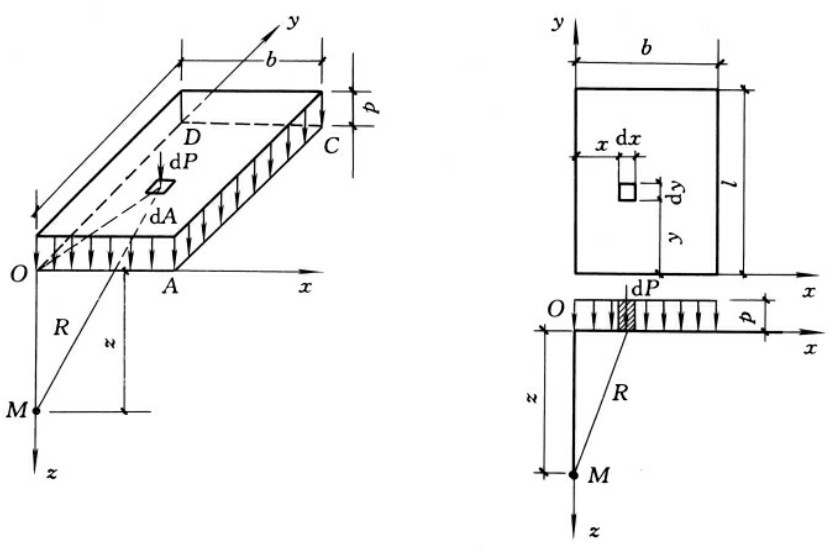 矩形基础在建筑工程中是最常见的,如房屋建筑的框架结构立柱下面的独立基础底面通常为矩形面积。在中心荷载作用下,基底压力按均布荷载计算。下面讨论矩形面积上各种分布荷载在地基中引起的附加应力计算。