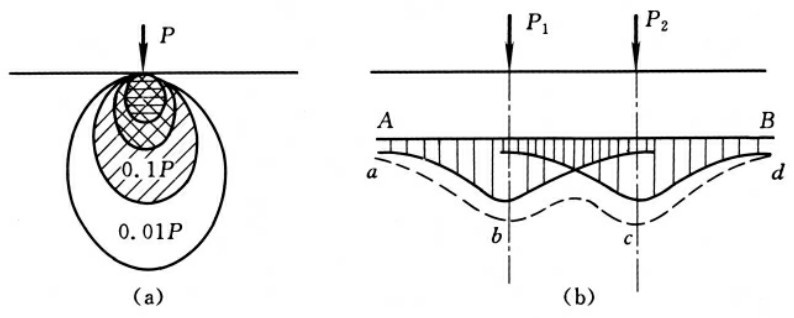 如果地面上有若干个集中力作用,可采用叠加法,先分别计算出各个集中力在土中任一深度的水平面所引起的附加应力,再把它们叠加起来,即得若干集中力共同作用产生的附加应力。如图2-14(b)所示为两个集中力作用的情况下,在AB水平面上所引起的附加应力图。应力叠加结果(图中虚线)比一个集中力时大得多,这种现象称为应力集聚现象。