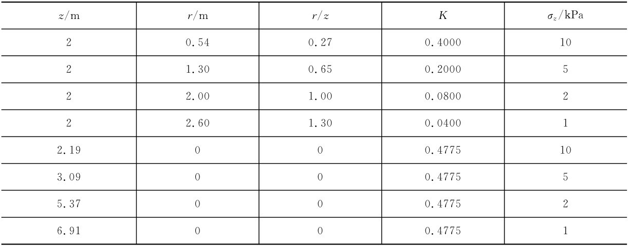 表2-7 均布圆形荷载中心点下的附加应力系数K0