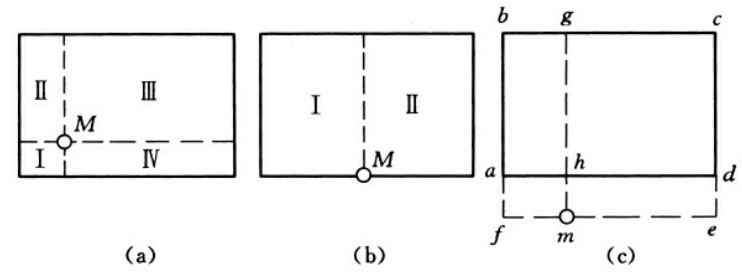 实际计算中,常会遇到计算点不位于矩形角点之下的情况。这时可加几条辅助线,通过需计算的点,把荷载面图形划分为若干个小矩形,使该计算点成为各小矩形的公共角点,然后根据叠加原理,将各矩形面内荷载在该点引起的应力叠加起来即可。