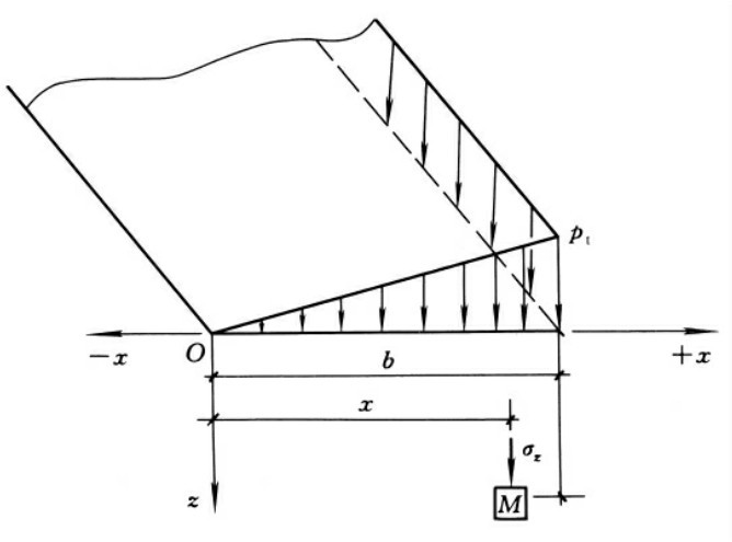 这种荷载分布可能出现在挡土墙基础受偏心荷载、路堤填土的质量产生的重力荷载等情况。如图2-23所示,在地基表面作用三角形分布条形荷载,其最大值为pt。土中任意一点M(x,z)的附加应力为