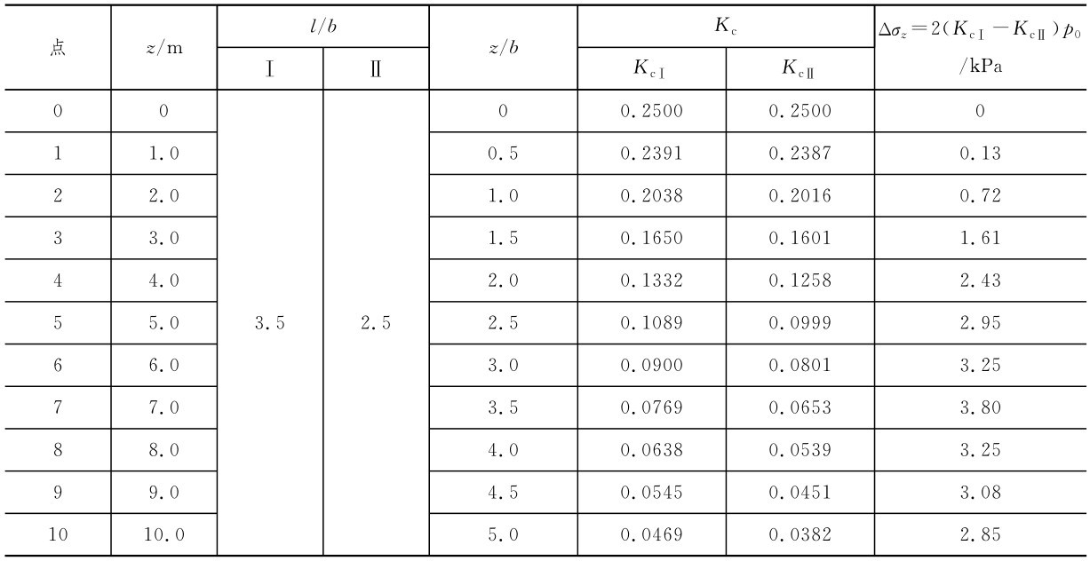 通过基础中心点O将基础分为两个相等的矩形荷载面积Ⅰ(Oabc和Oafh)和两个相等的矩形荷载面积Ⅱ(Odec和Odgh)。其中,荷载面积Ⅰ的长l=7.0m,宽b=2.0m;荷载面积Ⅱ长l=5.0m,宽b=2.0m,利用式(2-12(a))(或查表2-3)列表计算Δσz,见表2-5,Δσz分布图如图2-19中阴影线所示。