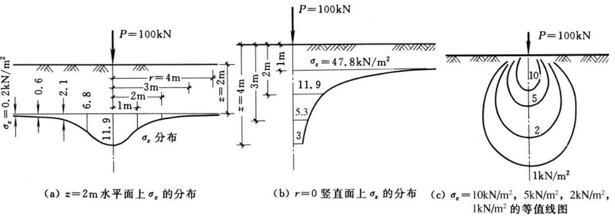 (2)距离地面越深,附加应力分布的范围越广,在同一竖向线上的附加应力随深度的变化而变化。