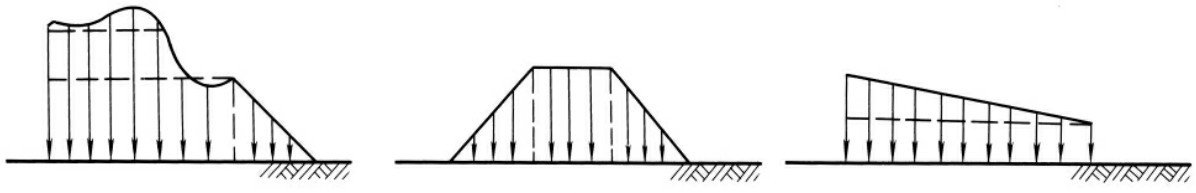建筑物作用于地基表面的荷载分布是多种多样,如图2-11所示。但各种不同分布的荷载都可以划分成均匀分布和三角形分布荷载的组合,如图2-11中虚线所示。所以,本章只详细介绍均布荷载和三角形荷载作用下地基附加应力的解法。按照弹性力学的求解方法,地基附加应力计算分为空间问题和平面问题两类,集中力、矩形面积荷载和圆形面积荷载下的解答属于空间问题;线荷载和条形荷载下的解答属于平面问题。应该注意的是,实际中没有集中荷载(任何荷载都有其作用面),但集中荷载的解是求解上述荷载解的基础,应用集中力的解答,通过叠加原理或者积分的方法可以得到各种分布荷载作用下土中应力计算公式。