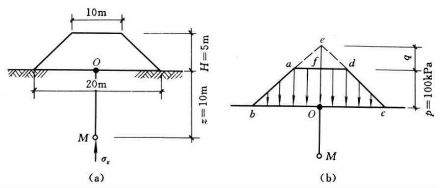 [例2-5] 有一路堤如图2-24(a)所示,已知填土重度为20k N/m3,求路堤中线下O点(z=0)及M点(z=10m)的竖向应力σz值。