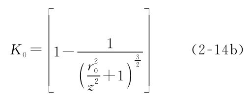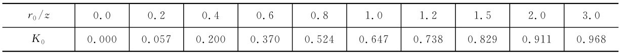 式中,K0为圆形面积均布荷载作用时,中心点下的竖向附加应力分布系数。