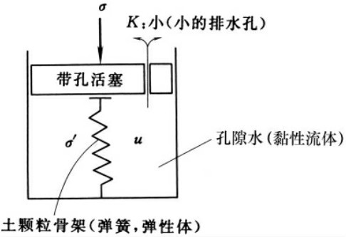 从上述固结现象的模拟过程可看出:在某一压力作用下,饱和土的固结过程就是土体中各点的超孔隙水压力不断消散、有效应力相应增长的过程,或者说是超孔隙水压力逐渐转化为有效应力的过程,而在这种转化的过程中,任一时刻任一深度上的应力始终遵循着有效应力原理。