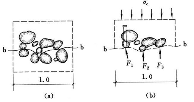 现考虑3-14(b)的平衡条件,设横断面面积为1。应力σz是由b—b面上面的土体的重力、静水压力以及外荷载所产生的应力,称为总应力。设孔隙水压力为u,作用在土ё 触点上的各力表示为F1,F2,F3,…各接触面面积为A1,A2,A3。垂直于b—b面的F1,F2, F3,…各力的法向分量的和称为有效应力: