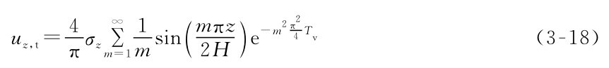 根据图3-16所示的土层和受荷情况,可求得式(3-17)的特解。这些初始条件和边界条件(可压缩土层顶、底面的排水条件)为